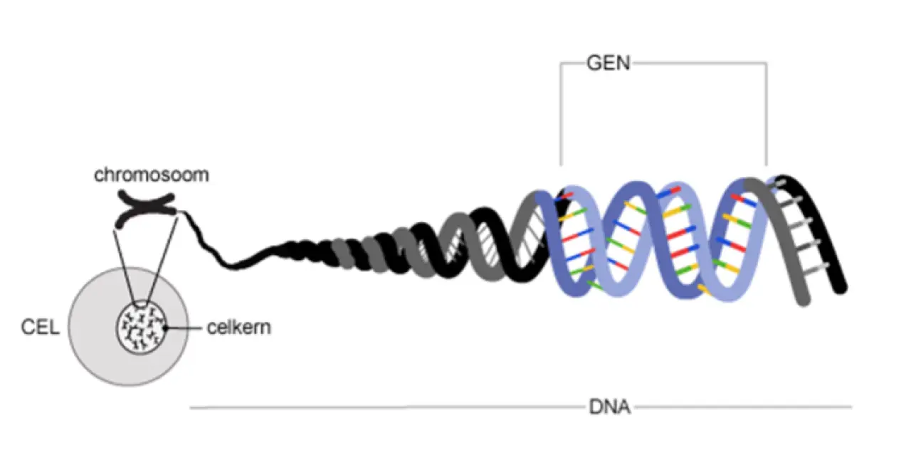 In iedere cel van het menselijk lichaam zit een kopie van het erfelijk materiaal in de vorm van chromosomen. Chromosomen kun je je voorstellen als lange strengen. Ze bestaan uit een stof die we DNA noemen. Op de chromosomen zitten de genen, stukjes afgebakend DNA die onze erfelijke eigenschappen bepalen, zoals de kleur van ons haar en de kleur van onze ogen. Deze erfelijke eigenschappen dragen wij over aan onze kinderen. Ieder kind erft 23 chromosomen van de vader en 23 chromosomen van de moeder.