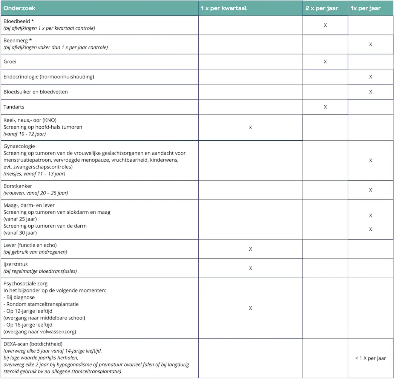 In een schema zien de controles er als volgt uit: (Bron: Richtlijn Fanconi anemie, 2025)