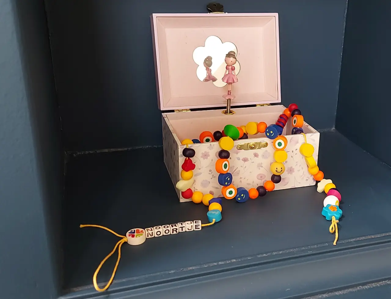 Tijdens de behandeling kreeg Noortje na elke prik de rode ‘prik’ kraal voor aan haar Kanjerketting. Nu ze niet meer in behandeling is en haar ketting is afgerond, zochten wij iets om deze goed in te bewaren. Omdat het muziekdoosje de rode draad is in Noortje haar reis rondom kinderkanker, bewaren wij haar Kanjerketting op een mooie plaats in onze woonkamer, in een muziekdoosje.